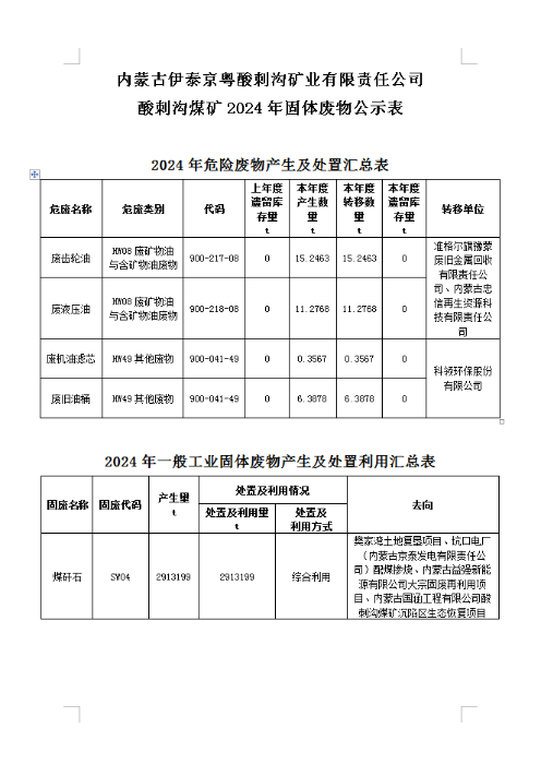 内蒙古富联娱乐京粤酸刺沟矿业有限责任公司 酸刺沟煤矿2024年固体废物公示表 <span>发布时间:2025-01-15</span> | <span class="views">关注:<b id="viewCountId">8</b></span> | <a href="javascript:void(0)" class="print"><i class="ion"></i></a> 内蒙古富联娱乐京粤酸刺沟矿业有限责任公司酸刺沟煤矿2024年固体废物公示表.docx 返回列表 上一条 下一条